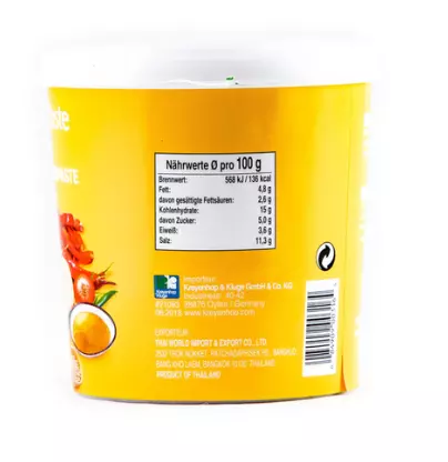 Класична желтая паста карри (Yellow Curry Paste) от Cock Brand - сбалансированная комбинация куркумы, лемонграсса, кориандра, кумина, чеснока и галангала. Идеальная база для тайских карри с курицей, морепродуктами, тофу, овощами и картофелем с добавлением кокосового молока.